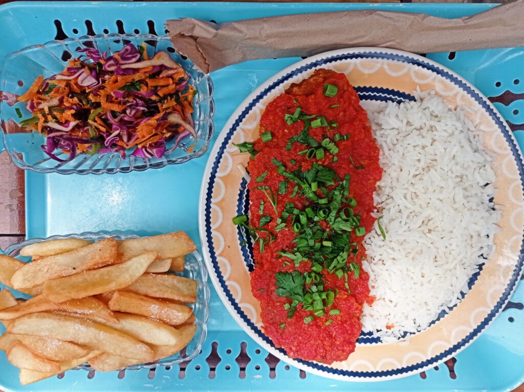 Cada dia tem sua estrela, como por exemplo, a costela bovina às sextas-feiras, feita com mandioca e aquele tempero caseiro, acompanhada de salada, arroz e feijãozinho. Muito gostosa! Mas ainda é possível pedir o parmegiana de frango a qualquer dia da semana, feito com um delicioso molho de tomate da casa, saboroso e artesanal, que vem sobre o peito de frango empanado, bem sequinho, além de batatas rústicas e saladinha.