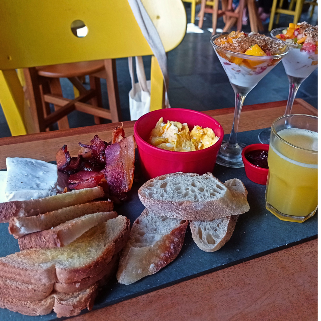 Brunch – Eu, que ainda não conhecia o Brunch da casa, provei a opção Brunch Rapport 1 para compartilhar, o que inclui 2 bebidas quentes à sua escolha, 2 sucos de laranja, pães, geleia artesanal da casa (divina), manteiga, ovos mexidos com bacon, 2 minis parfait de frutas da estação feitos com iogurte natural, frutas, mel e castanhas trituradas, 2 fatias de queijo minas frescal e 2 fatias dos bolos do dia, por 89,00. Tem uma apresentação linda e serve muito bem duas pessoas. Se não quiser um brunch completo, tem croissant por 10,00 e tapioca com ovo mexido por 18,00, por exemplo.