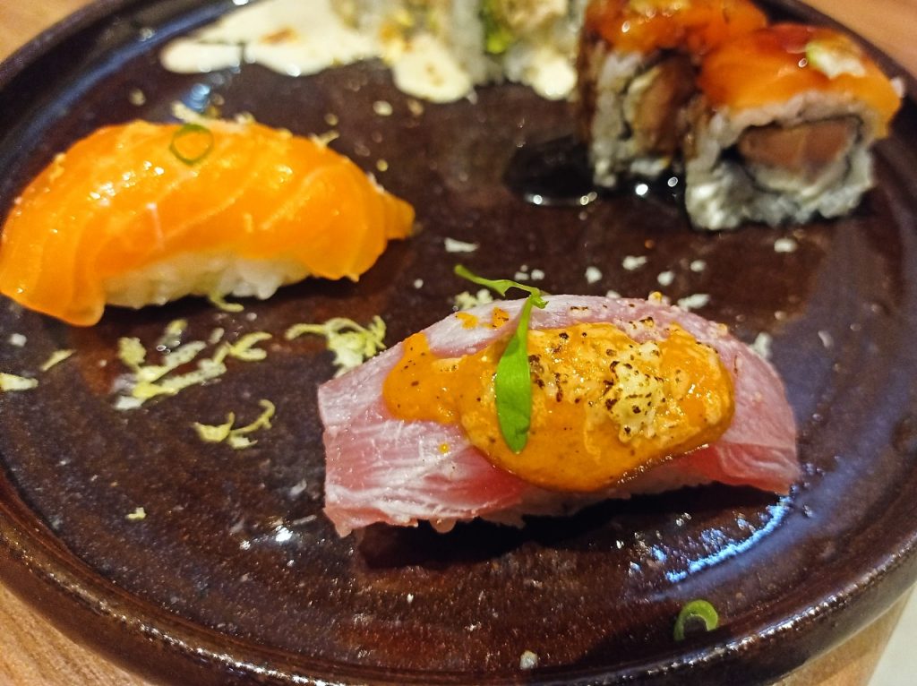 A ideia da casa é explorar a linha Nikkei mesmo, com um pouco de Japão, nos sushis, sashimis muito especiais, incluindo vieiras canadenses, atum e polvo. Os Makimonos em 06 ou 10 peças como Tuna Spicy tartar de atum, óleo de gergelim e cebolinha (R$38,00); Quinoa, mais suntuoso, com camarão bata, caranguejo, quinoa e togarashi (R$49,00) e o delicioso Shogun, com camarão e abacate, que eu amo (R$46,00).