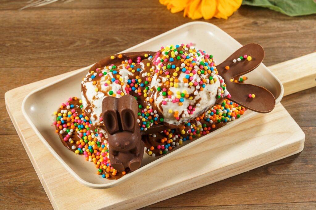 La Paleta – Delícia de Páscoa: uma banda de ovo de chocolate com orelhas de coelho, 2 generosas bolas de sorvetes, 1 cobertura, 1 topping e um mini coelho de chocolate recheado com sorvete de vanilha (R$ 40, para 2 pessoas).