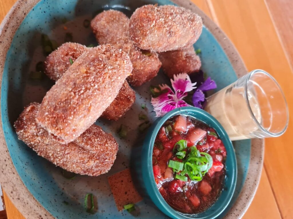 - Croquete de carne cremosa com vinagrete de morango do Rota Leste