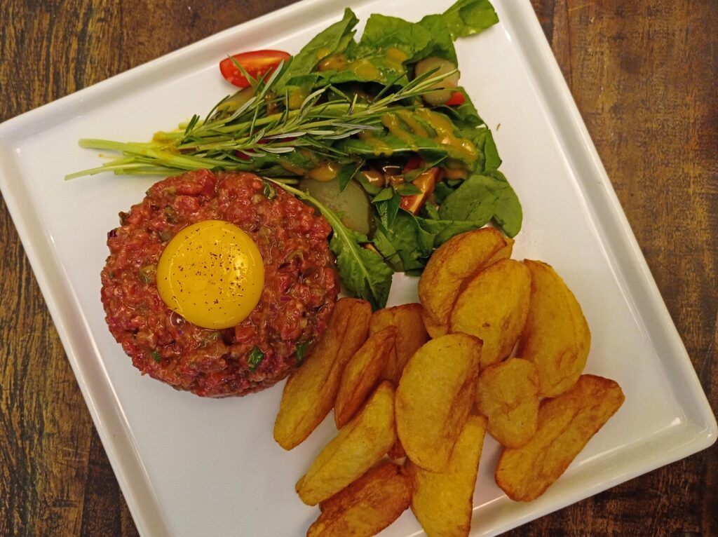 Assim, temos como o básico: filé mignon fresco, cortado à ponta de faca, temperado e com algum toque de acidez. Servido com ou sem uma gema mole de ovo e acompanhado de fritas ou torradinhas.
