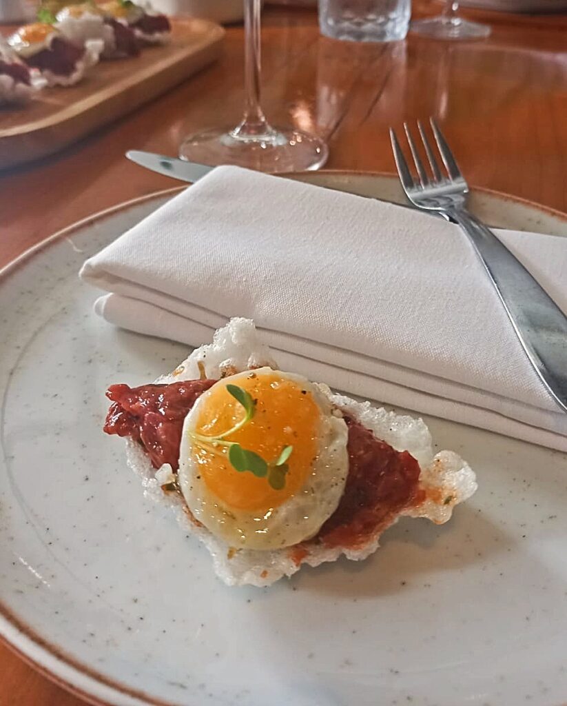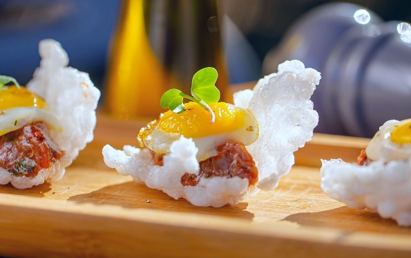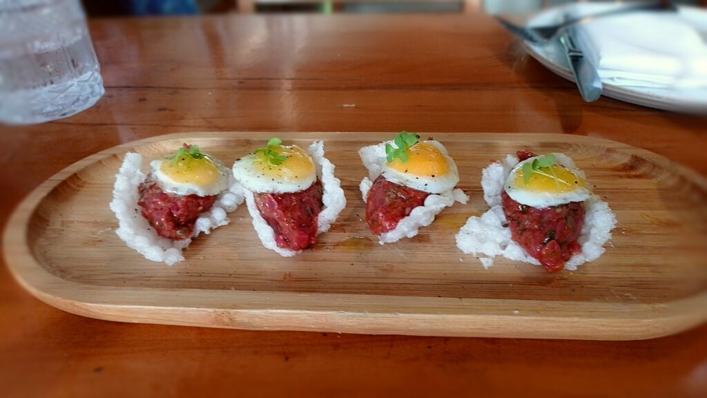 Estou falando de uma apresentação única, em que o filé, devidamente picado, vem servido numa base de crocante de tapioca, super leve, com um ovo de codorna com gema gelatinosa em cima.
