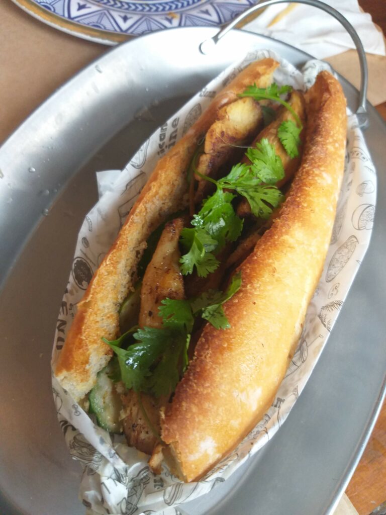 Aqui em Brasília, o restaurante Same Same oferece no cardápio versões com barriga de porco – minha preferida – frango desfiado, carne em tiras ou com tofu, para vegetarianos, sempre combinados com a baguete recheada com pepino, picles de nabo e cenoura e molho especial (maionese asiática + sriracha).