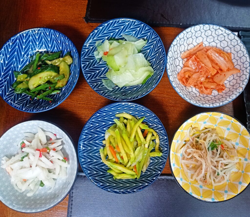 Qualquer pedido de principal garante ao cliente o serviço de um trio, quarteto ou sexteto de pratinhos típicos, como kimchi, legumes, como abobrinha e nabo, broto de bambu e pepino, todos preparados tradicionalmente.