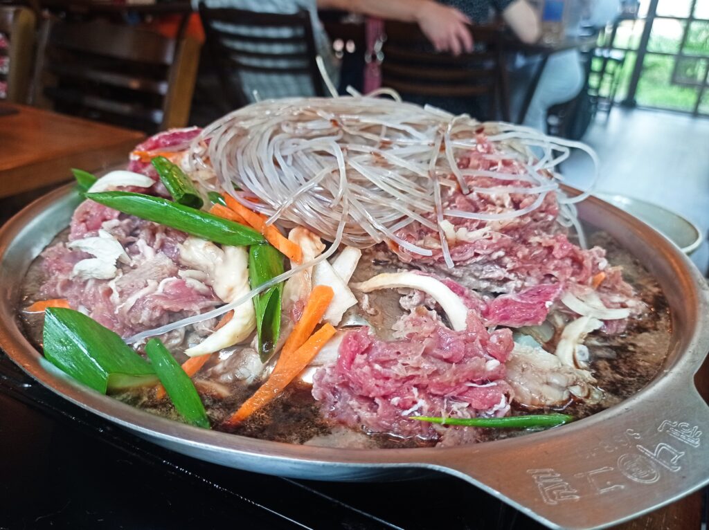 Já o Bulpan Bulgogui (R$ 185), chamado também de “churrasco coreano”, é uma surpreendente combinação de tiras bem finas de contra filé preparado na frente do cliente, com um molho especial da casa, legumes, cogumelo e um divino macarrão de batata doce, quase transparente, muito típico da Coreia.