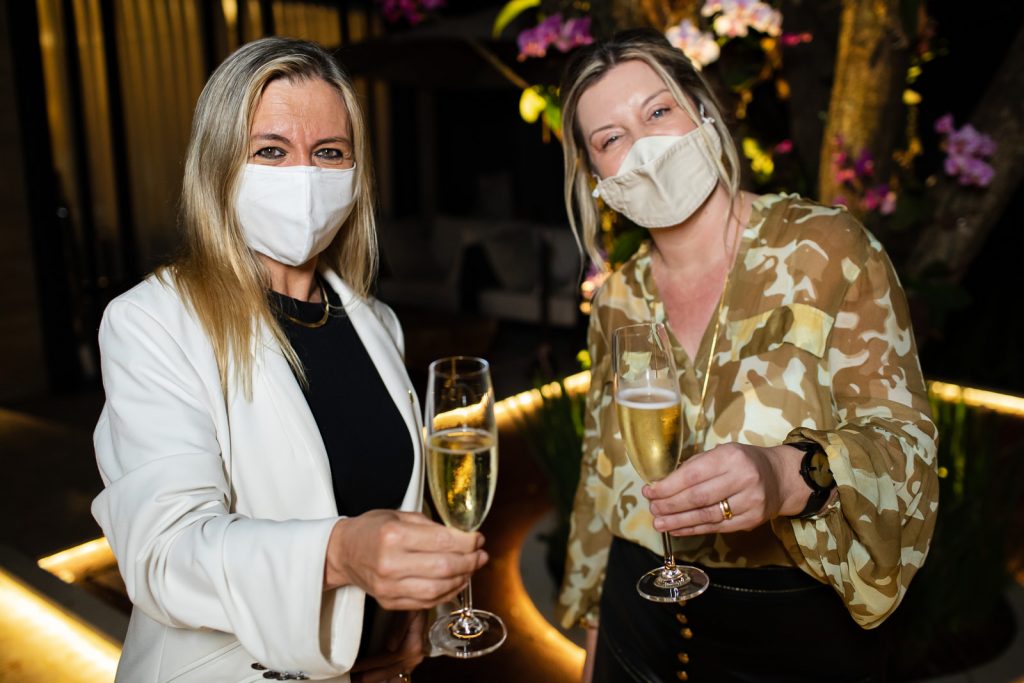 O brinde da secretária de Turismo Vanessa Mendonça com Keli Mayer, que tomou todos os cuidados na noite por conta da pandemia de covid-19