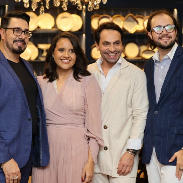 Os anfitriões da noite — Hendy Miranda, Mônica Tachotte e Valter Lourenço — ao lado do galerista Antonio Aversa, receberam um público seleto para a apresentação oficial do projeto. A recepção contou com espumantes da Vinhos S.A e gastronomia assinada pelo Federal Buffet, completando a experiência de uma noite dedicada ao encontro entre estética, pensamento e sensibilidade.