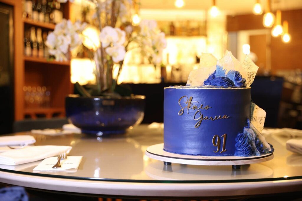 - Um dos destaques da festa foi o bolo, feito especialmente para a ocasião pelo chef patissier Ronaldo Honoratto, do Mirante da Rocinha. O bolo, todo em tons de azul marinho, a cor preferida de Stênio, foi decorado com detalhes em ouro e cristais, o que o tornou ainda mais especial. Ícone da TV, o ator possui 60 anos de carreira.