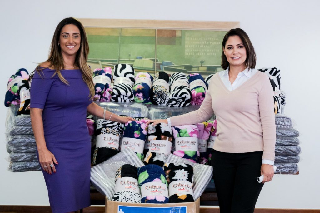A ministra-chefe da Secretaria de Governo, Flávia Arruda, entregou cobertores à campanha do agasalho do Programa Pátria Voluntária, liderado pela primeira-dama Michelle Bolsonaro. O encontro ocorreu ontem, no gabinete da ministra, localizado no Palácio do Planalto.