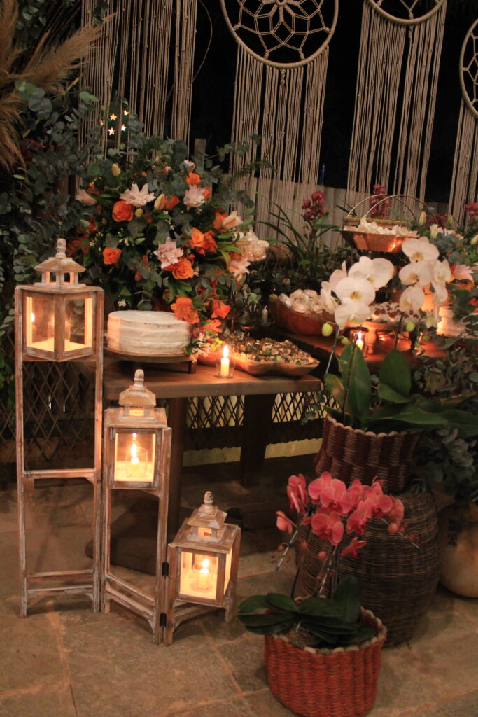 Após a cerimônia, o buffet do Chef Almeida serviu os convidados com variadas opções de antepastos, seguido de um jantar elaborado com capricho, finalizado na madrugada com opções de caldos e massas preparados na hora. A festa começou embalada com Thiago Coimbra e banda, seguida pelo som do DJ Thiago Roots que só terminou ao amanhecer.