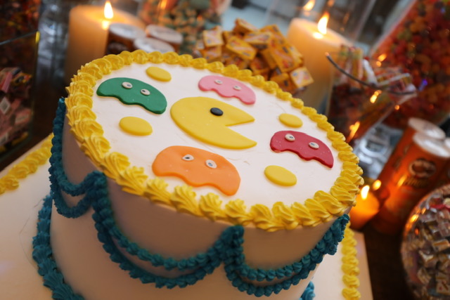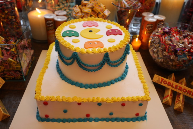 - No cardápio da noite, destaque para os deliciosos empratados servidos pelo Mangê Buffet. Para refrescar, drinques criativos preparados na hora, além de espumante geladinho. A mesa do bolo foi um capítulo à parte: o bolo fazendo referência ao jogo de Atari, Pac Man, popular nos anos 1980, e a mesa com doces, bombons, jujubas e uma infinidade de belisquetes saborosos.