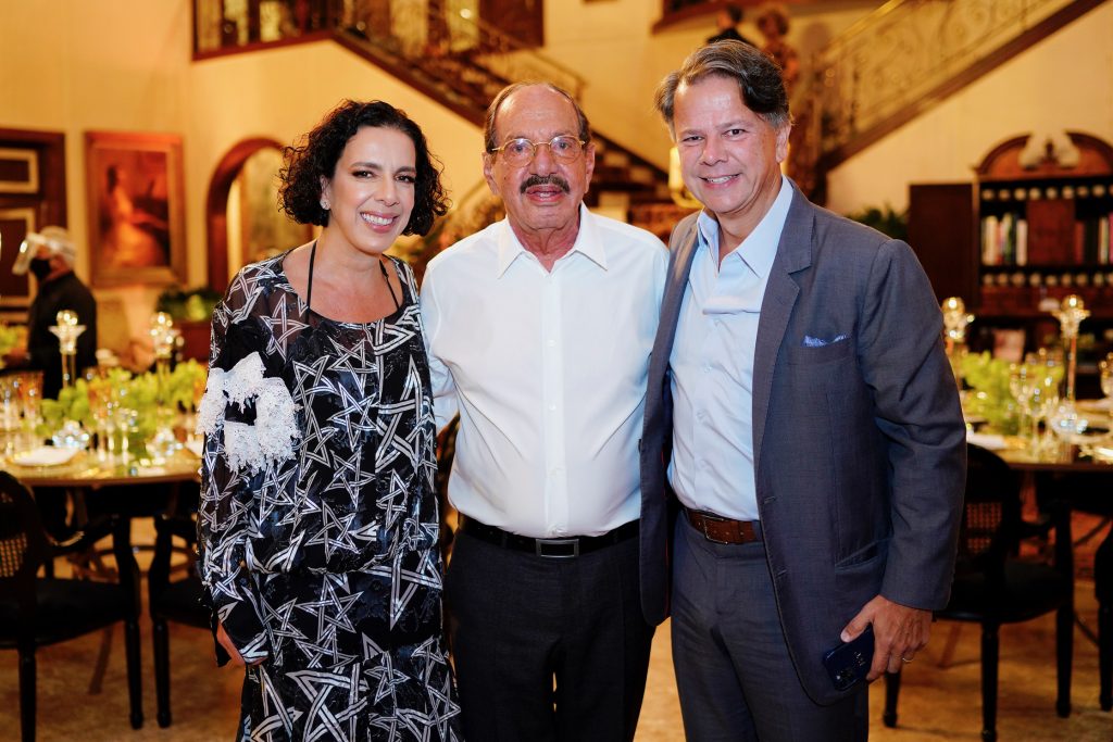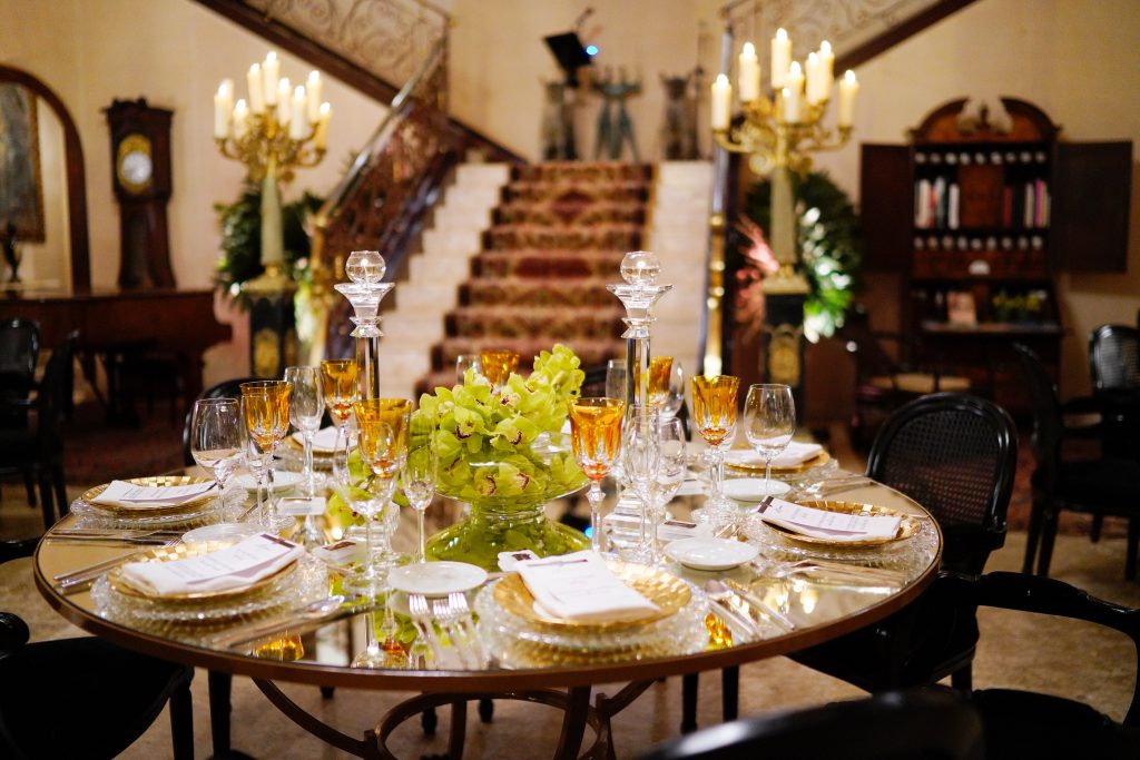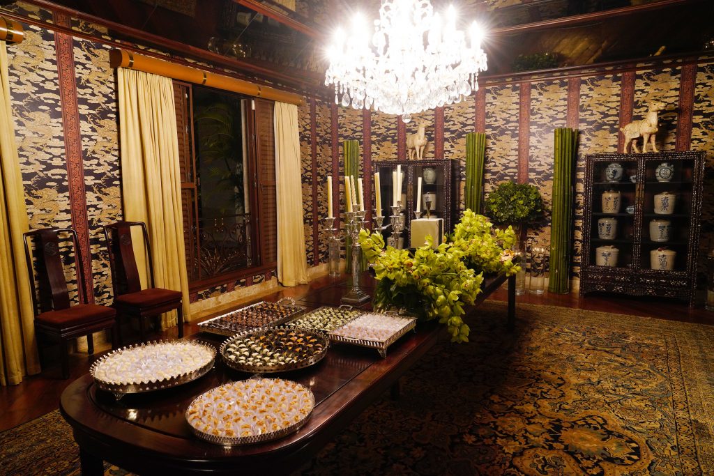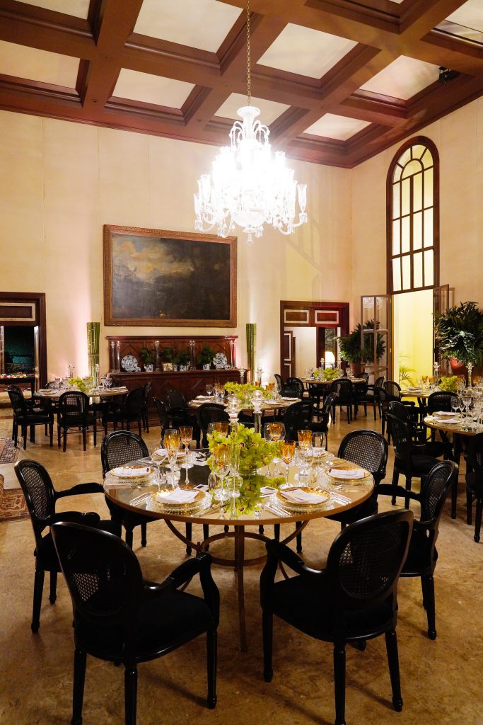 O salão principal da mansão, ganhou ambientação assinada por Valéria Leão Bittar, que usou costelas-de-adão em profusão com bambus e orquídeas verdes. No cardápio da festa, delícias como arroz de pato, carré de cordeiro e bacalhau. Tudo do bom e do melhor, harmonizado com vinhos franceses e o champanhe francês Piper-Heidsieck.