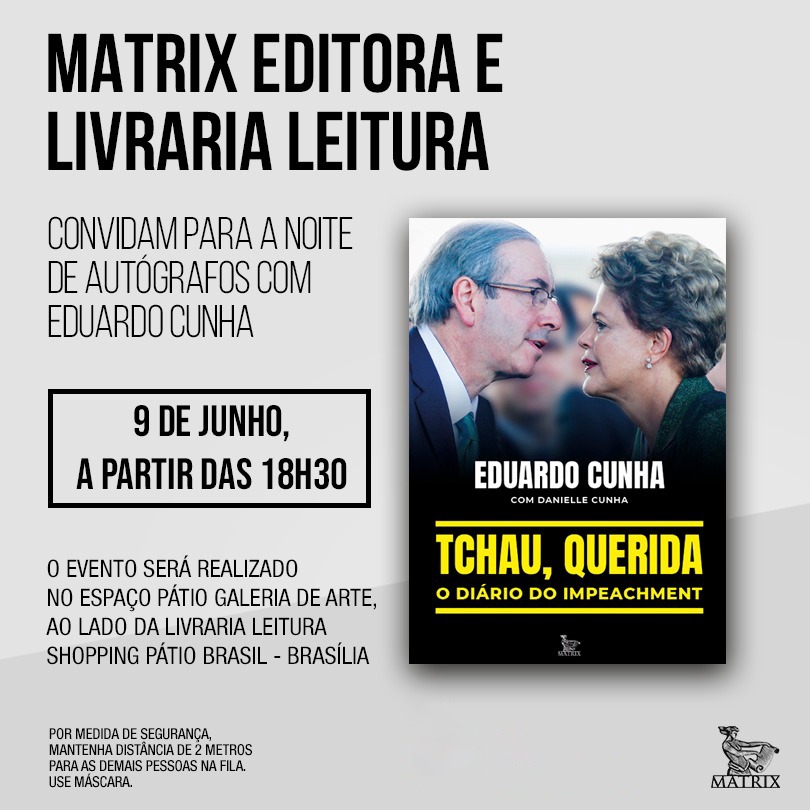 Eduardo Cunha, ex-presidente da Câmara dos Deputados, lança na próxima quarta-feira, dia 9, às 18h30, no Espaço Pátio Galeria de Arte, do Pátio Brasil Shopping, o livro Tchau, querida: o diário do impeachment, sobre os bastidores do processo sofrido pela ex-presidente Dilma Rousseff. A obra é considerada sucesso em vendas. A expectativa é que a noite seja movimentada e com a presença de nomes poderosos da capital federal.