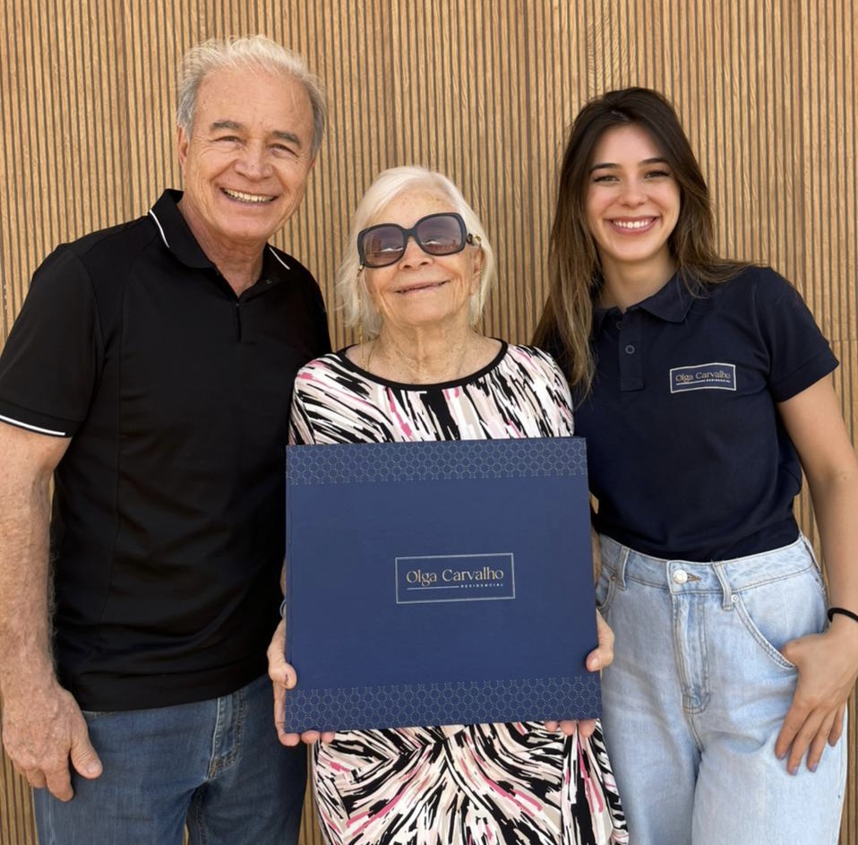 Homenagem mais que especial. A pioneira Olga Carvalho ganhou uma homenagem merecida no último fim de semana. Um dos empreendimentos da Construtora HC, pertencente à sua família, lançou um edifício de luxo no Setor Noroeste que ganhará o nome de Residencial Olga Carvalho. Dona Olga ficou emocionada com a iniciativa e com o carinho recebido na ocasião. Na foto, a homenageada entre o filho Sebastião Carvalho e a neta Cecília.