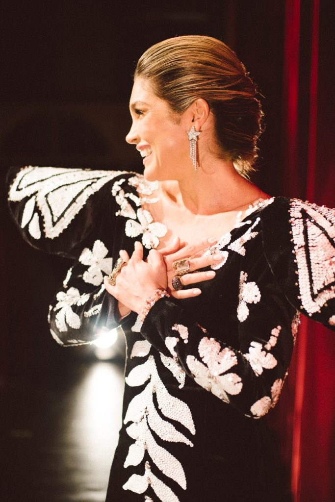 O look contou com mais de 15 mil lantejoulas e foi feito com exclusividade para a apresentadora, que usou a peça em sua estreia no SBT, em 1986. Ao Gshow, Flávia falou da emoção ao usar o longo e as joias da comunicadora: “Pensei numa mulher que, para mim, é a brasileira fantástica, atemporal, que é Hebe, porque eu a amo uma vida inteira. Eu realmente me emocionei durante o processo, me fez brotar lágrimas de emoção de eu estar sendo Hebe por um dia”, disse a atriz.