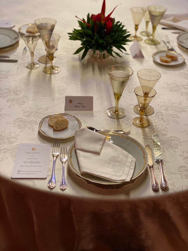 A noite foi pautada por conversas agradáveis sobre os dois países e também sobre a pandemia. O embaixador estava feliz pois pela idade tomaria esta semana a primeira dose da vacina contra a covid-19. O elogiado jantar com deliciosas iguarias típicas do país teve o cardápio assinado pelo talentoso chef Valerio Centonze, que atua há alguns anos na embaixada em Brasília.