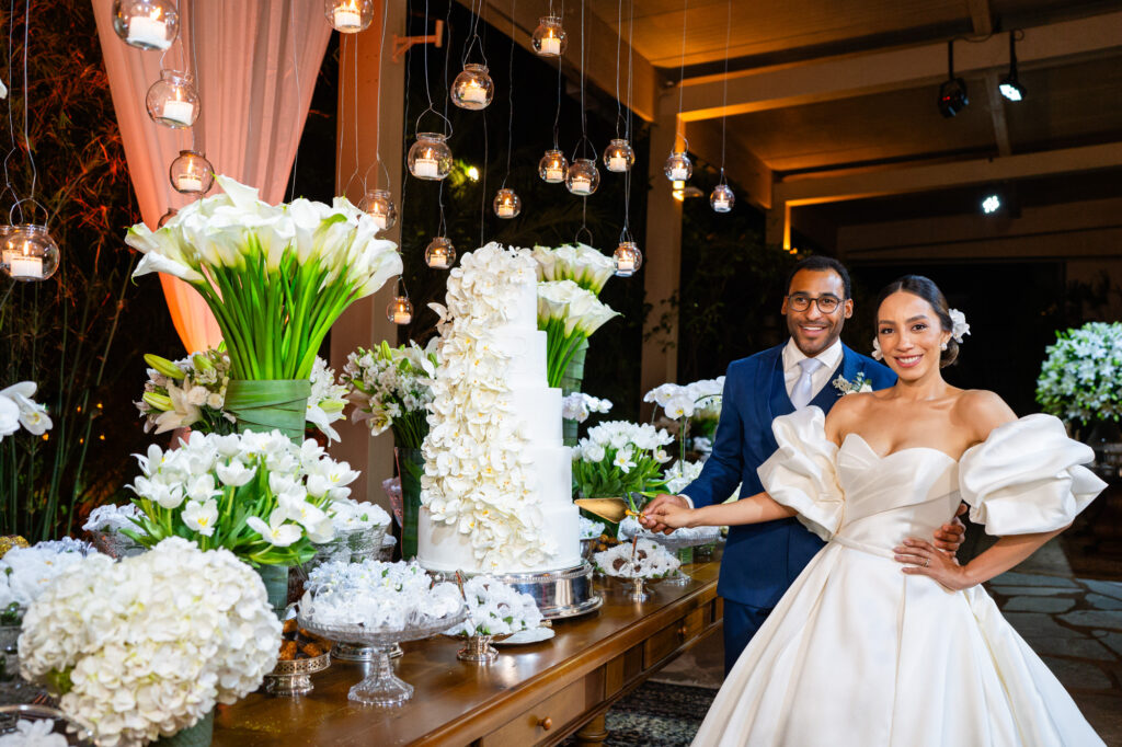 - Estilista formada em Nova York, Bárbara subiu ao altar com uma criação na cor off white da gigante espanhola Pronovias, adquirida na Magnólia Noivas, e véu e grinalda assinados pela designer filipina Monique Lhuillier. Após o sim, todos seguiram para festa que atravessou a noite.