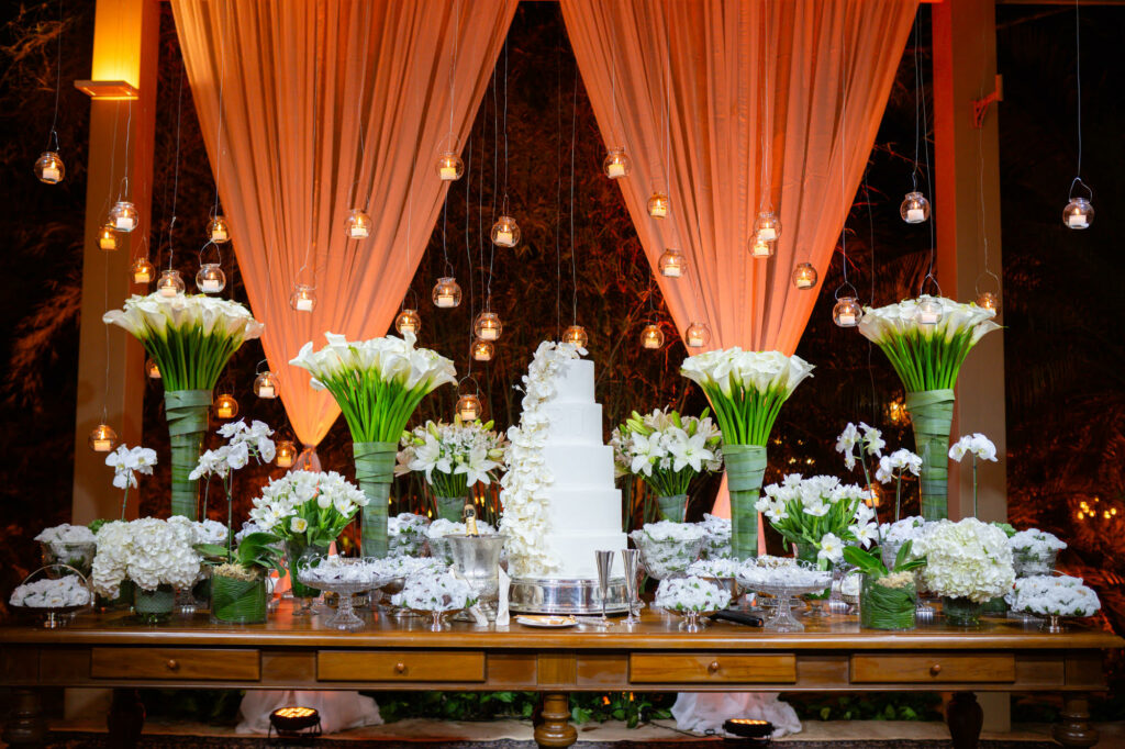 - Mãe da noiva, Carla Meireles foi a perfeita anfitriã do evento, que contou com cardápio especial elaborado pela banqueteira Renata La Porta, cerimonial de Carla Rogado e decoração nas cores branco e verde. Tudo escolhido minuciosamente por Carla e pela filha Bárbara, que ajudou a mãe na organização do casamento.
