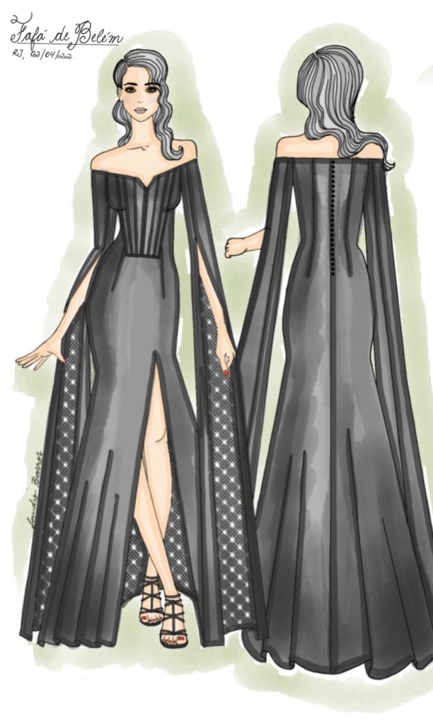 Para a final do programa Fafá usará um vestido sob medida do Atelier Sandro Barros, em veludo preto, decote, capa em zibeline, forro bordado em tulle ilusionne preto com paetês prata. Um luxo!