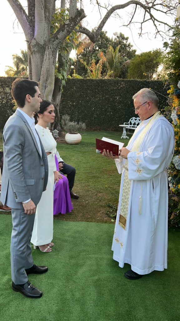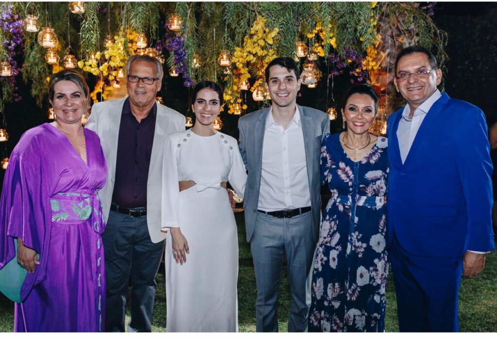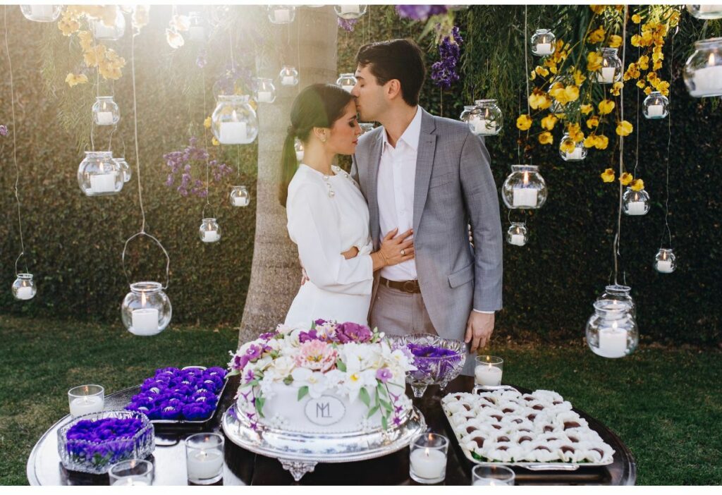 - As cores lilás e amarelo ganharam destaque na decoração idealizada pela mãe da noiva, com colaboração do designer floral Higor Lima. Uma variedade de velas também compôs a ambientação. O padre Marcelo Cecato, da Paróquia Nossa Senhora de Guadalupe, deu a bênção ao casal pontualmente no pôr do sol, como desejado por Manuella. Com cerimonial de Cristina Gomes, a tarde contou com catering do Bloco C com destaque para a mesa de antepasto e para o champanhe Veuve Clicquot servido.