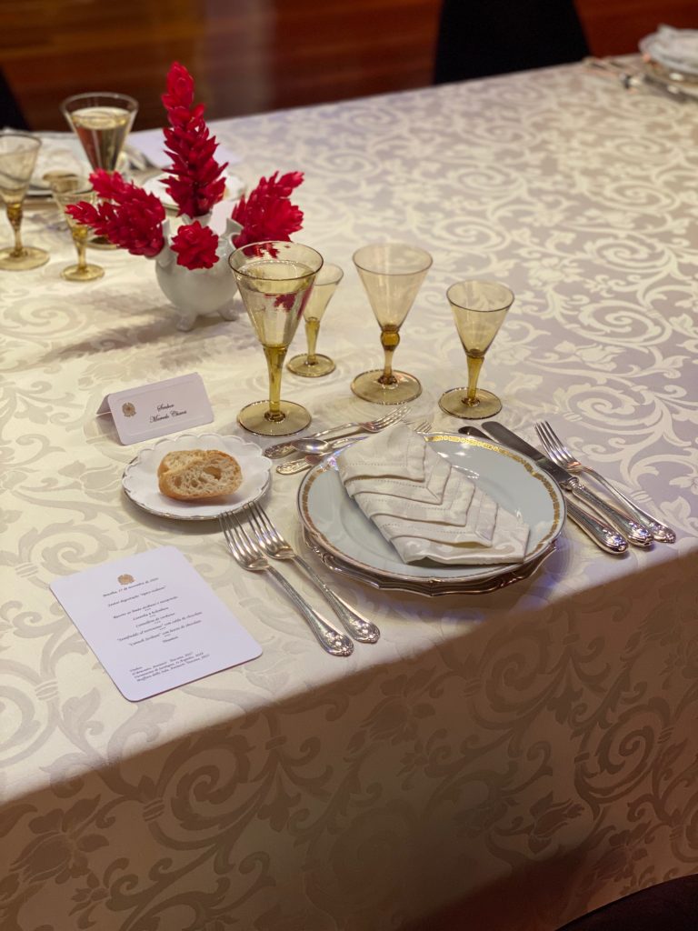 Na entrada da sala jantar, um mordomo com o mapa dos lugares à mesa, direcionava cada convidado. Entre louças com o brasão da república italiana e pratarias, destaque para cardápio trazendo as iguarias preparadas pelo chef Valerio Centonze. Uma verdadeira viagem gastronômica pelo país europeu. Entre as delícias degustadas, estavam o risoto ao limão siciliano e manjericão e a lasanha à bolonhesa harmonizados com vinhos italianos.