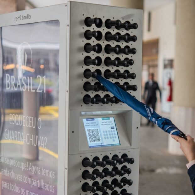 O Complexo Brasil 21, comandado pelo empresário Fabiano Cunha Campos, está com novidade. O local abriga a primeira unidade da Rentbrella no DF. Trata-se de uma estação de empréstimo gratuito de guarda-chuvas. Basta instalar o aplicativo da empresa, retirar e devolver em até 24 horas. Só haverá cobrança (R$ 2) se passar do prazo da entrega.