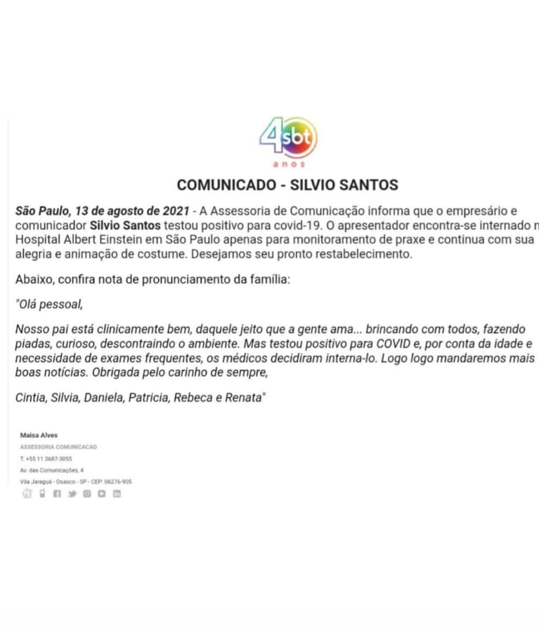 São Paulo, 13 de agosto de 2021 – A Assessoria de Comunicação informa que o empresário e comunicador Silvio Santos testou positivo para covid-19. O apresentador encontra-se internado no Hospital Albert Einstein em São Paulo apenas para monitoramento de praxe e continua com sua alegria e animação de costume. Desejamos seu pronto restabelecimento.