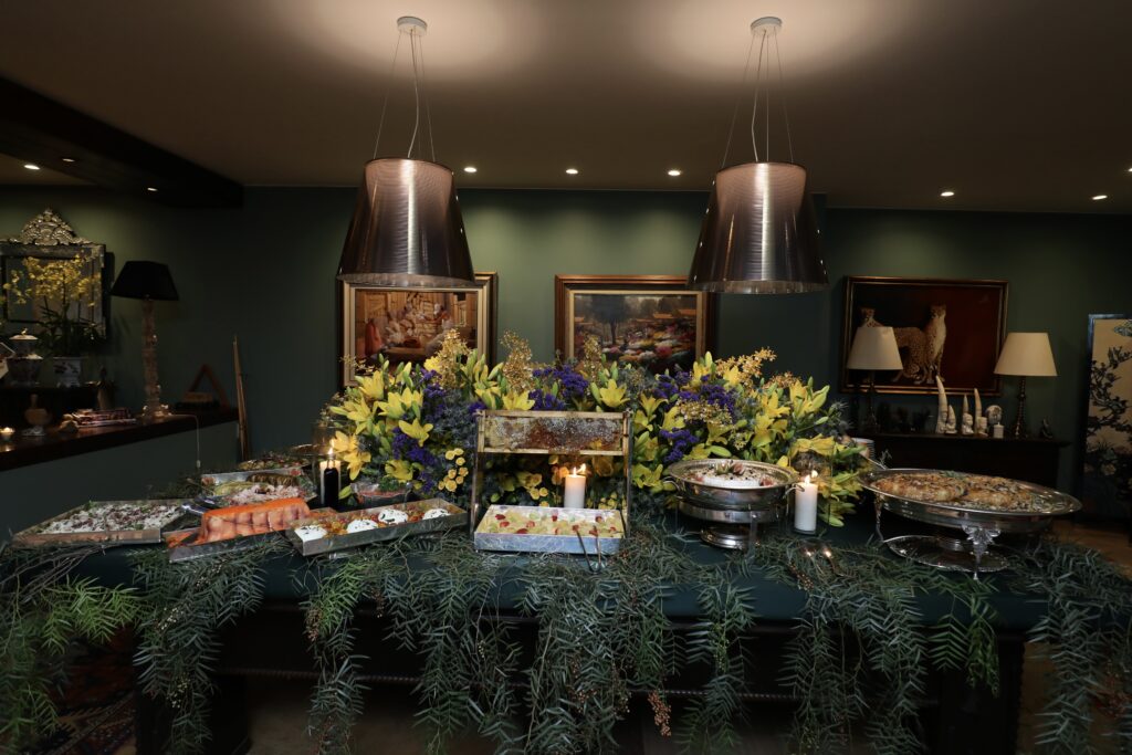 - O banqueteiro Celso Jabour, do Buffet Sweet Cake, foi o responsável pelo delicioso cardápio servido no fim de tarde que invadiu a noite em clima de descontração. Uma elaborada mesa de antepasto, trazia inúmeras delícias, como presunto de Parma, queijo brie e uma saborosa torta de salmão com caviar, entre outras iguarias que também foram degustadas pelas convidadas presentes na ocasião.