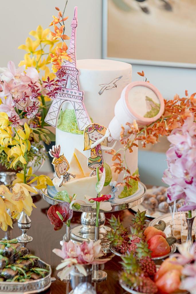 - Um dos destaques da tarde ficou por conta dos bolos assinados por Alex Alvino. “O bolo maior trazia a arte de Duda Abreu que remetia a Alix retornando com os filhos para Paris. Os três restantes traziam referência às três pátrias da homenageada: Torre Eiffel (Paris), Corcovado (Rio) e o Château de Beloeil, sua morada de infância”, explicou Isadora.