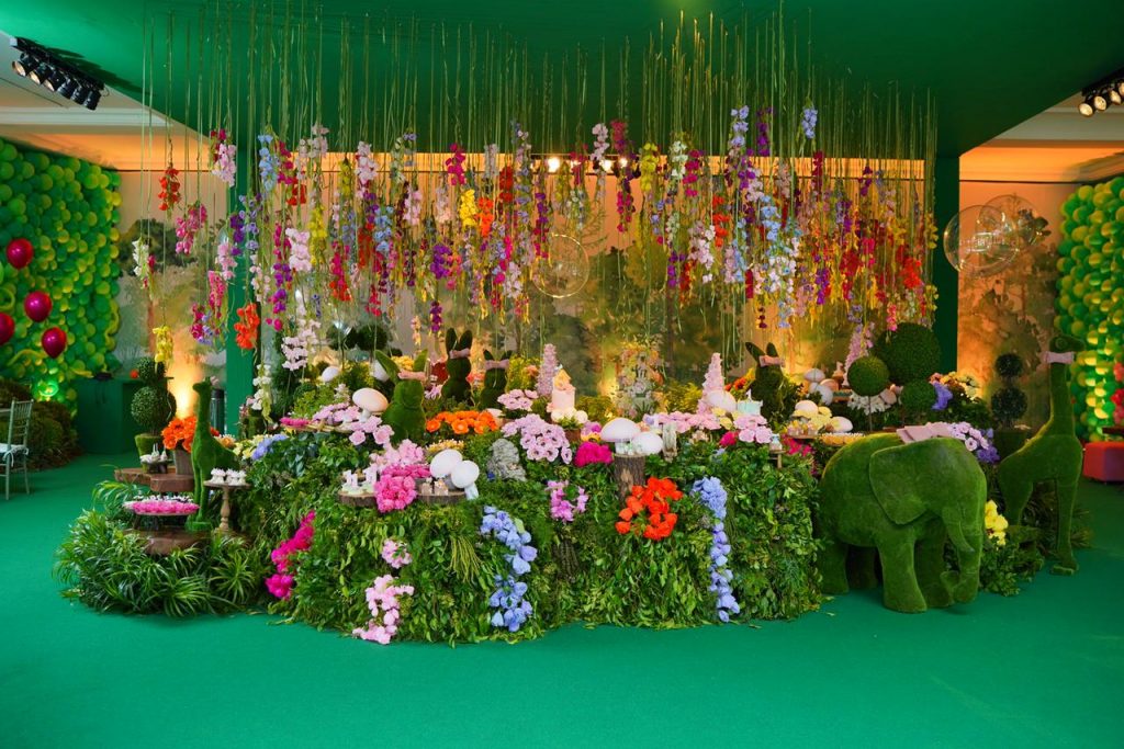 O casal de empresários Thiago Araújo e Luana Sarkis comemorou em grande estilo a chegada do primeiro ano da filha Tarsila. Uma floresta encantada com flores, plantas e animais como girafa e elefante foi materializada nos jardins do espaço de eventos Recanto das Águas, no Park Way, pelas mãos da decoradora Valéria Leão Bittar para celebrar a data.