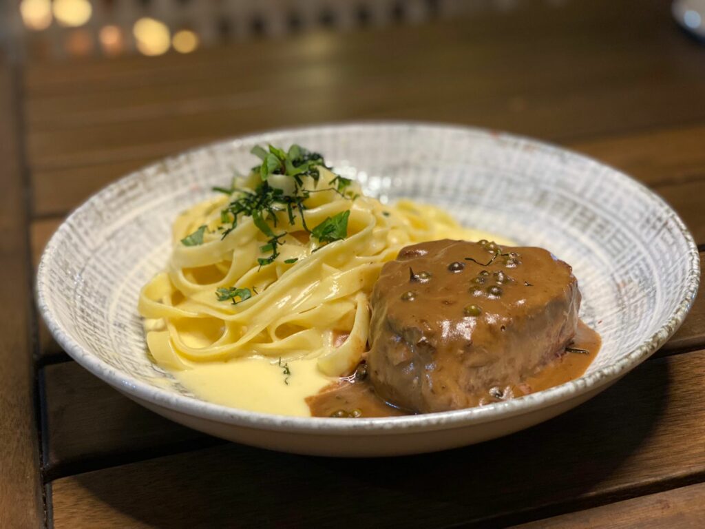Até o dia 12 de junho, o Mezanino disponibiliza a Temporada Torre 360 BRB. Um projeto para os amantes terem um momento especial nas alturas, no mirante da Torre de TV. A 75 metros do chão, contará com música ao vivo, decoração exclusiva e um menu de quatro etapas harmonizado com um cenário incrível. Como prato principal, duas são as alternativas. Primeiro, o Raviolone Negro (foto), um raviolone de Nero de Sepia recheado com Camarão, crema de parmesão, redução de Champagne e crudo de Atum; e segundo, o Carré Tartufo, um Carré de Cordeiro grelhado com polenta trufada, pesto de rúcula, lascas de parmesão, farofa de amêndoas e baby life.