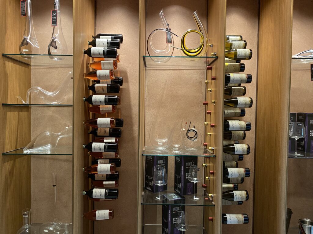 Além dos vinhos, é possível comprar taças e decanters da marca austríaca Riedel que leva a experiência da degustação do vinho para um patamar mais elevado.