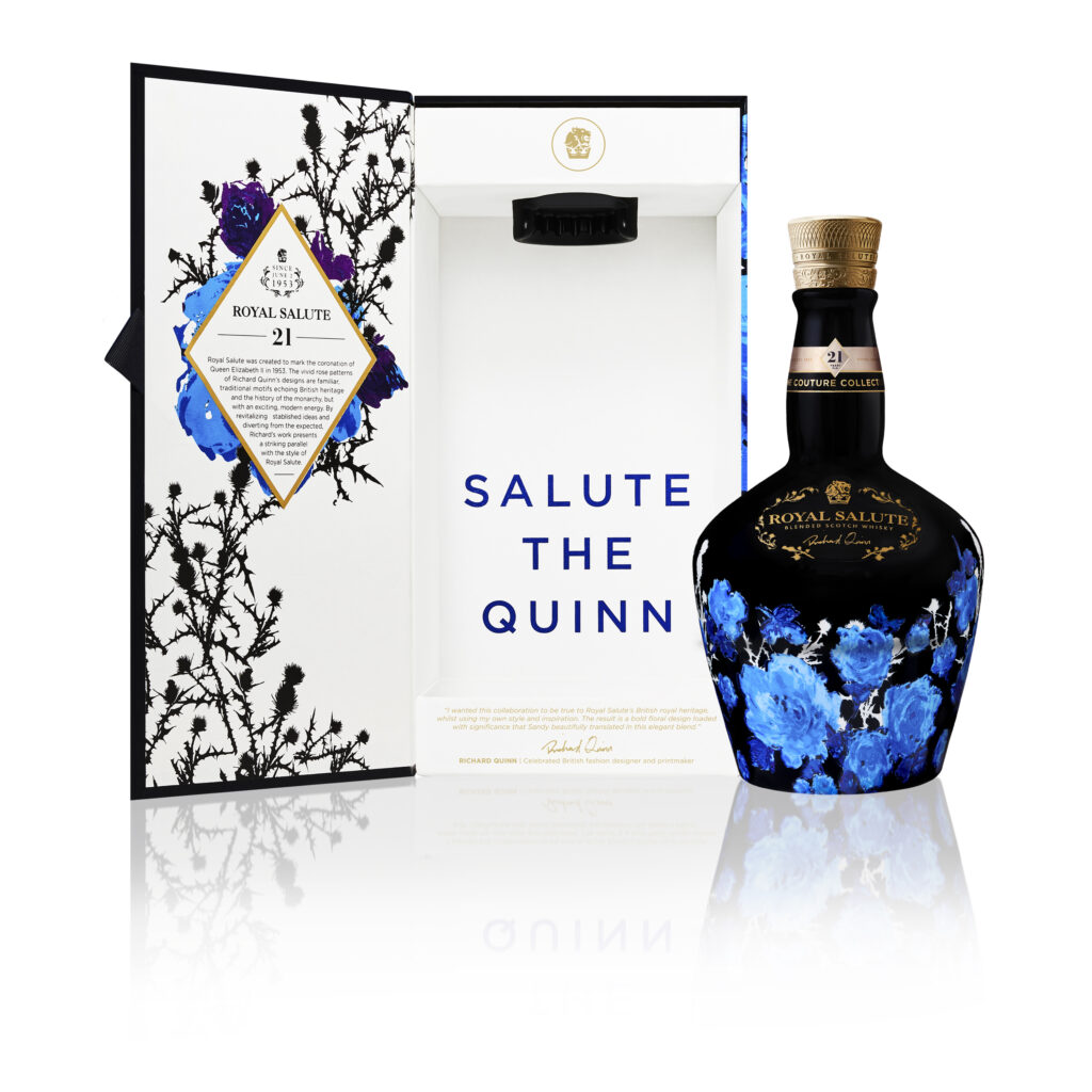 A Royal Salute Couture Collection, uma nova e ousada série de whiskies contemporâneos que celebram a criatividade de ponta no universo do fashion design, apresenta a coleção 21 Year Old Richard Quinn Edition. A união com um designer de vanguarda e disruptivo como o célebre Richard Quinn reforça a importância de as marcas explorarem outros territórios com a mesma sinergia e a capacidade de transmitir uma percepção mais apurada de suas mensagens-chave. O estilista está no olimpo da criatividade em alta costura no Reino Unido, e entrou para o rol de queridinhos de Sua Majestade, a rainha Elizabeth II, fã confessa de suas criações.