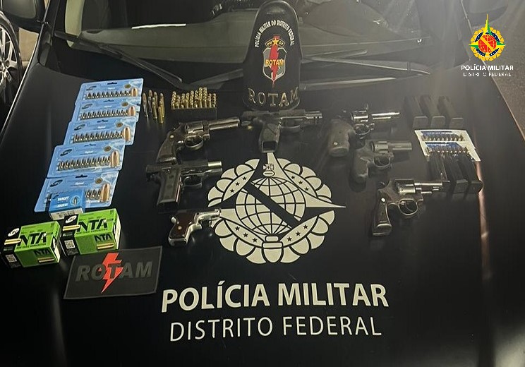 Em Ceilândia, dois homens foram presos com sete armas de fogo, uma pistola calibre .9mm, quatro revólveres calibre .38, uma pistola calibre .635, uma pistola calibre .380mm, 50 cartuchos de munição calibre .22, 29 cartuchos de munição calibre .635, 105 cartuchos de munição calibre .380, e 65 cartuchos de munição calibre .9mm.