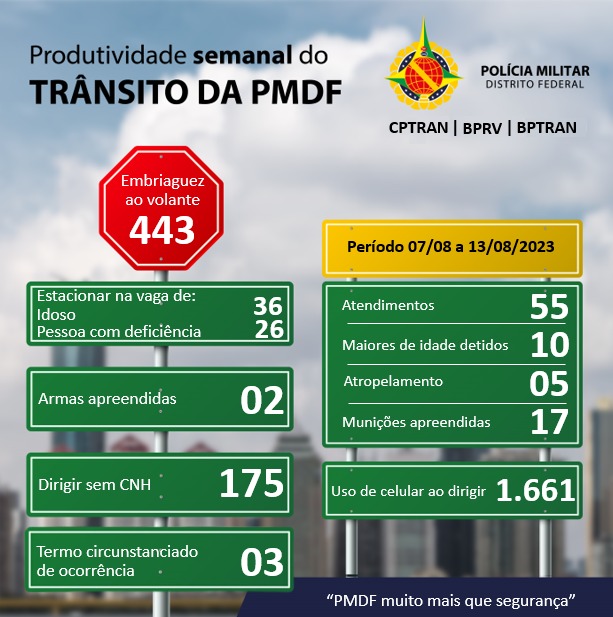 Em mais um balanço divulgado pela Polícia Militar do Distrito Federal das operações realizadas entre 7 e 13 de agosto, 443 condutorez foram autuados por embriaguez ao volante, o que significa um número alto, com média de 63 por dia.