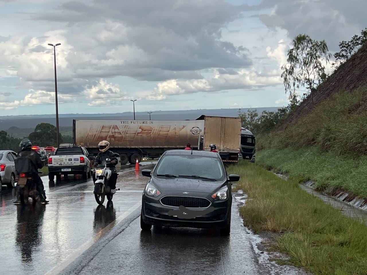 A carreta ficou atravessada e fechou a via por completo. As duas pistas permanecem interditadas.