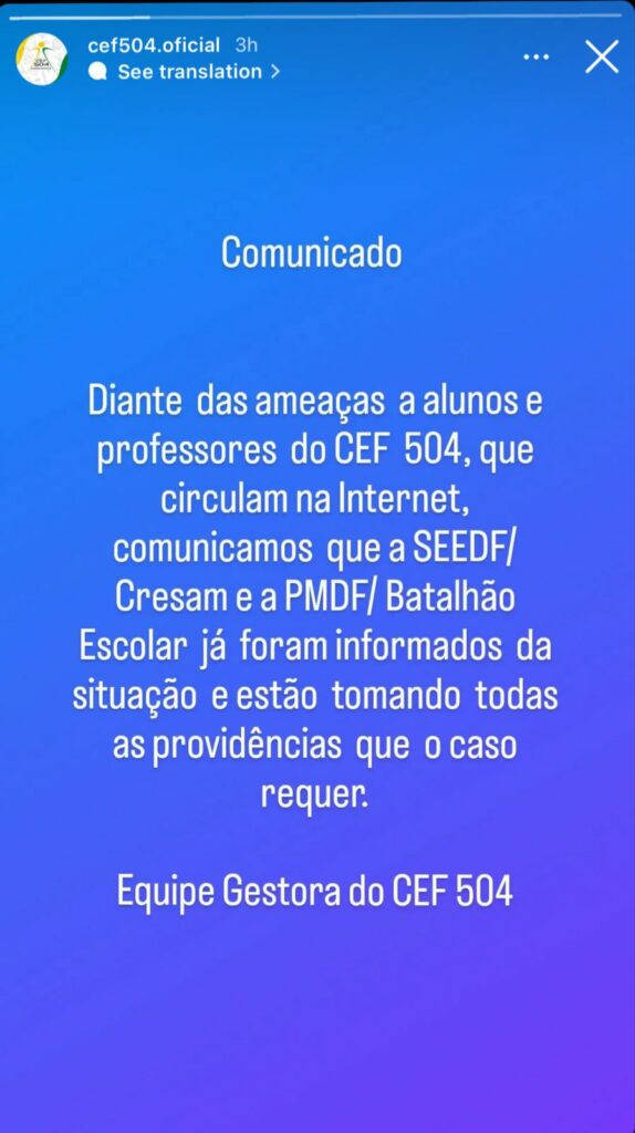 “Diante das ameaças a alunos e professores do CEF 504, que circulam a internet, comunicamos que a SEEDF/Cresam e a PMDF/Batalhão Escolar já foram informados da situação e estão tomando todas as providências que o caso requer”, escreveu a direção do colégio em um comunicado nas redes sociais.