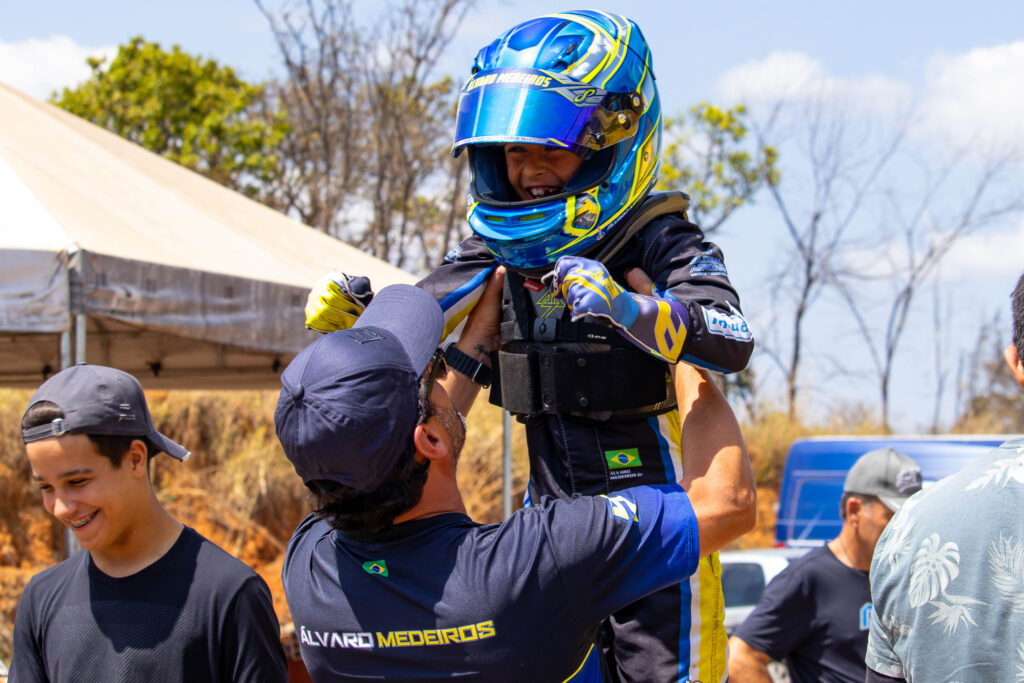 Atual campeão da Copa Brasil de kart, pela categoria Mirim, Álvaro Medeiros, de apenas 8 anos de idade, dá exemplo de empatia e reforça o título que recebeu de piloto mais querido do evento nacional. Líder da categoria no Campeonato de Kart do DF venceu as duas baterias realizadas neste sábado, no kartódromo do Paranoá. Na cerimônia de pódio fez uma linda homenagem ao colega Heitor Kliemann, iniciante na modalidade, que quebrou o braço durante os treinos da semana.