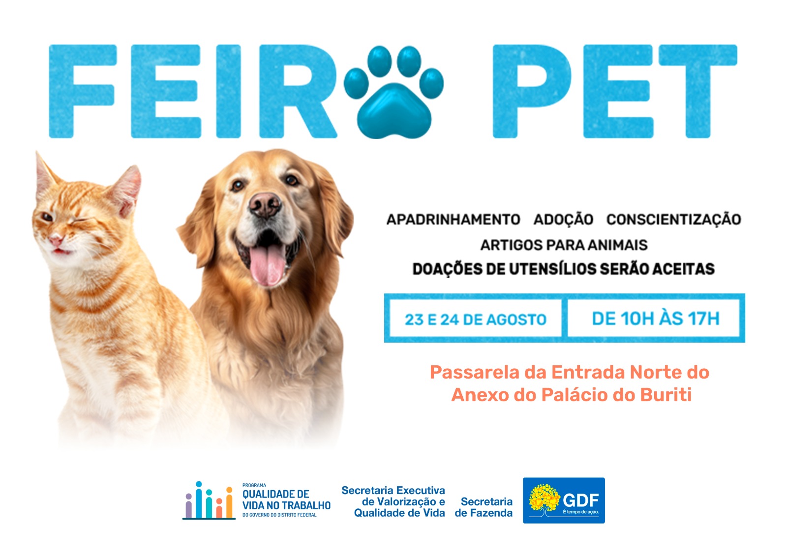 A Secretaria-Executiva de Valorização e Qualidade de Vida (Sequali) da Secretaria de Fazenda do DF (Sefaz), em parceria com organizações não governamentais (ONGs), realizará um evento inédito esta semana: a 1ª Feira Pet, direcionada aos servidores públicos do Distrito Federal. A feira acontecerá nesta quarta (23) e na quinta (24), das 10h às 17h, na passarela da entrada norte do Anexo do Buriti.