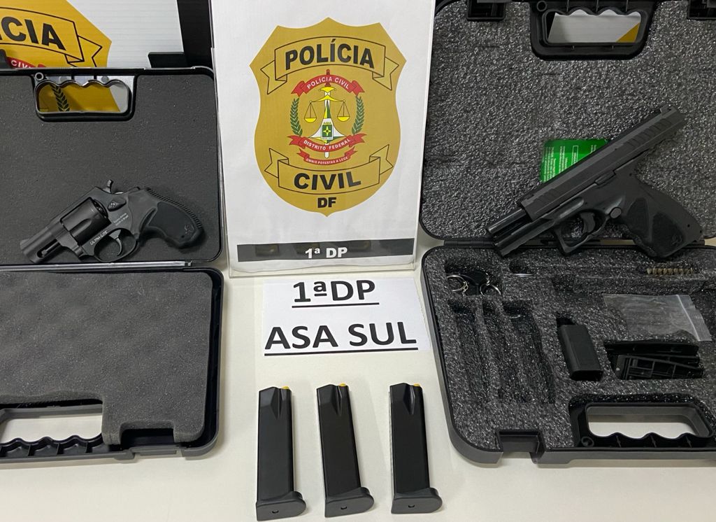 A Polícia Civil do Distrito Federal (PCDF) apreendeu uma pistola 9mm, com três carregadores, e um revólver calibre 38. O suspeito é acusado de intimidar o dono de uma pizzaria. O homem apresentou as armas de fogo para a apreensão sem resistir.
