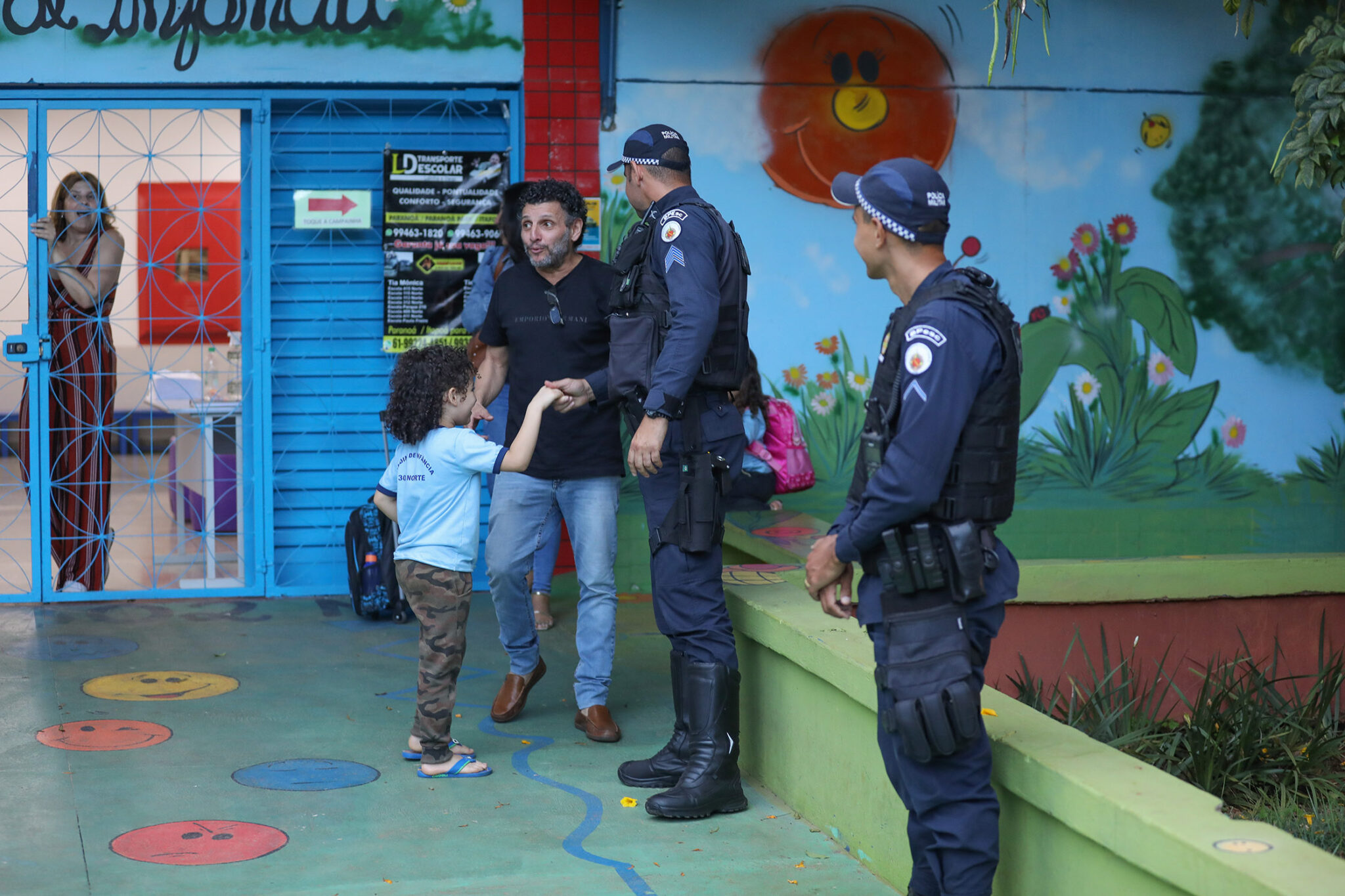 O pequeno Kaiky Carmon, de cinco anos, assim que saiu da escola, logo foi cumprimentar os policiais na saída. “Eu gosto quando eles estão aqui”, disse. “Quando vejo, dou ‘oi’ e converso também. Quando eu crescer, quero ser policial ou jogador de futebol”.