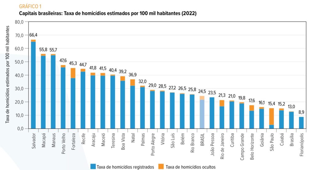 Segundo o Atlas, entre 2012 e 2022, a maior redução da mortalidade violenta veio do Distrito Federal (-67,4%). Essa queda fez a capital federal ultrapassar São Paulo, que detinha a menor taxa de violência.