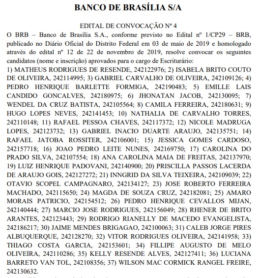 A lista foi publicada no Diário Oficial (DODF) desta terça-feira (18). Os aprovados deverão se apresentar em reunião virtual no próximo dia 24, às 15h, para tratarem de assuntos relacionados à contratação. Um e-mail será enviado pelo BRB com instruções para participar da conferência. Quem não comparecer será considerado desistente.