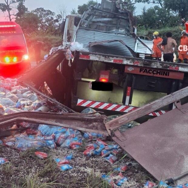 No local, os bombeiros encontraram um caminhão capotado, com a carga de arroz espalhada pela rodovia. As equipes realizaram o isolamento da área, sinalizaram a via e adotaram medidas de gerenciamento de riscos. Duas pessoas que estavam no veículo receberam atendimento inicial e, conscientes e orientadas, foram encaminhadas ao hospital de referência.