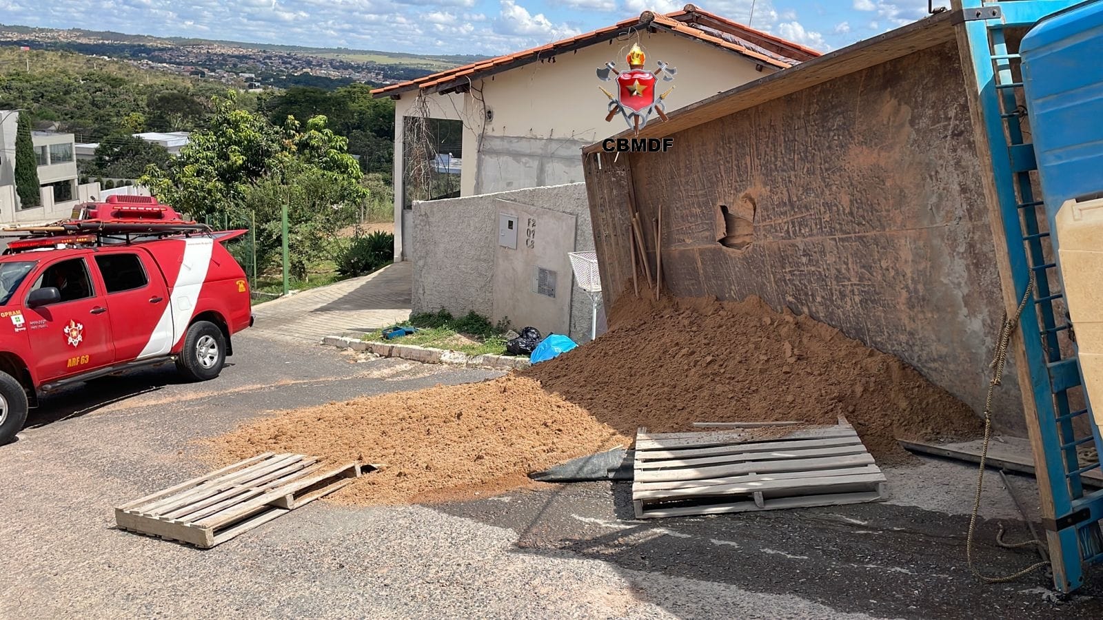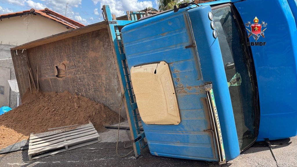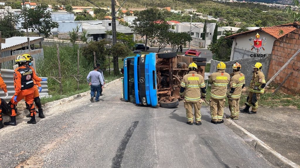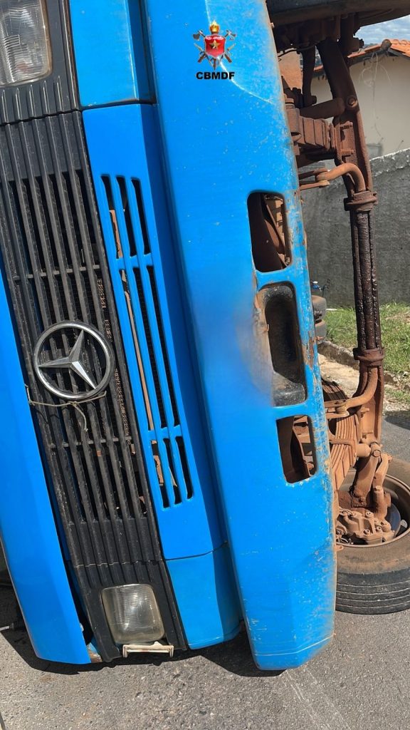 Um caminhão de pequeno porte capotou na tarde desta segunda-feira (18). O acidente aconteceu na rua do Condomínio Ouro Vermelho, fase 2, Quadra 7 da Região do Jardim Botânico – DF. O Mercedes-Benz de cor azul transportava materiais de construção e era conduzido pelo senhor J.R.S, 44, que perdeu a direção.