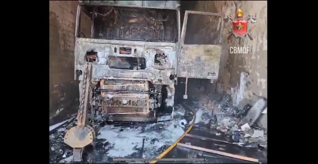 Ainda de acordo com a corporação, as chamas já começavam a se espalhar pelas de demais baias de manutenção da Concessionária de Caminhões DAF e outros caminhões que estavam no local.