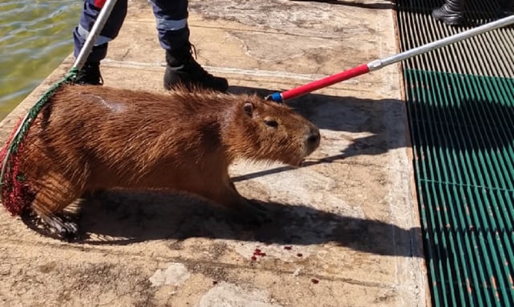 O animal estava no espelho d’agua quando foi capturado. Como aparentava estar machucada, a capivara foi levada ao Zoológico para atendimento veterinário.