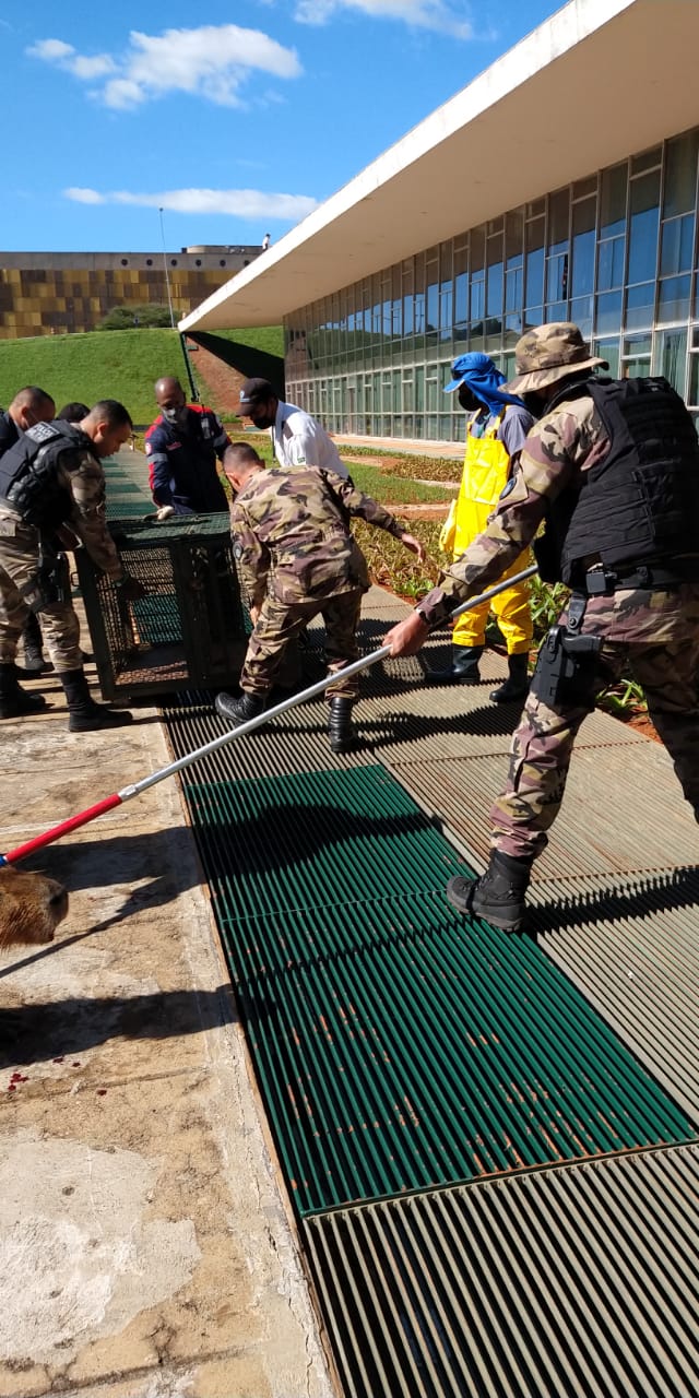 Policiais militares do Batalhão Ambiental resgataram uma capivara no Anexo da Câmara dos Deputados, por volta das 6h desta quarta-feira (20). As informações são da Polícia Militar do Distrito Federal (PMDF).