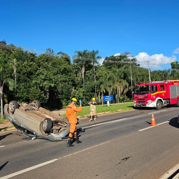 Um veículo capotou na L4 Norte, próximo à estação da Caesb, nesta quarta-feira (17). O Corpo de Bombeiros Militar do Distrito Federal (CBMDF) foi chamado para prestar socorro na cena.